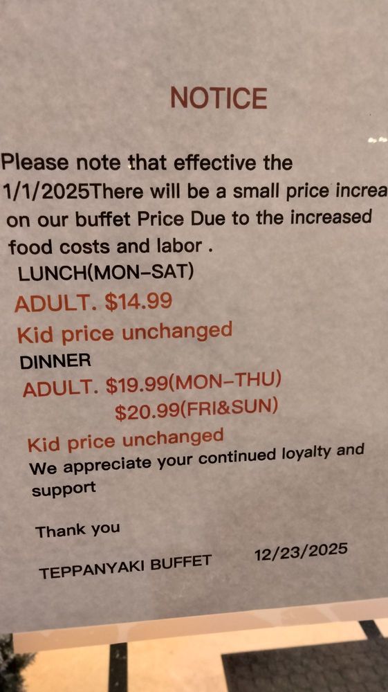 “ There's a slight price increase that's taped on front window entrance. I like this place a lot. If you're a fan of sashimi like I am, they offer tuna, salmon sashimi chunks on dinners Friday and weekends. Sashimi is OBVIOUSLY NOT high grade, but it's acceptable and satisfies my craving. If you are looking for high grade fish, then you shouldn't step into ANY Chinese buffet place . ”
